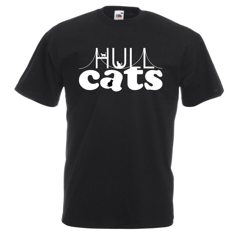 White cotton unisex tee with the Hull Cats logo printed in black.